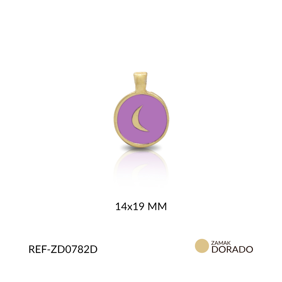 - Uso: Dije en zamak dorado con fondo en resina lila y diseño de luna en dorado. Su acabado es, ideal para elaborar pulseras, collares o tobilleras. Es un complemento simbólico que representa energía, feminidad y protección en la bisutería artesanal.