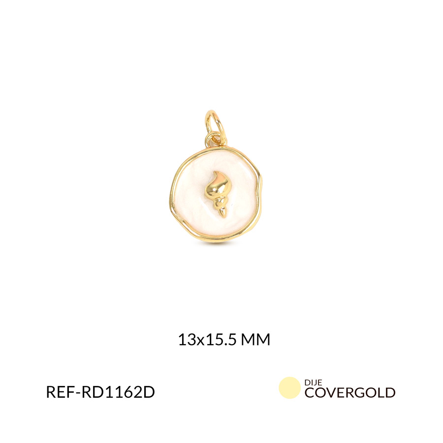 - Uso: Dije circular de covergold con una base de resina banca perlada y en su centro un caracol dorado, gracias a su diseño con resina y su acabado en un dorado brillante lo hacen una pieza elegante y encantadora para accesorios de estilo marino o playeros.