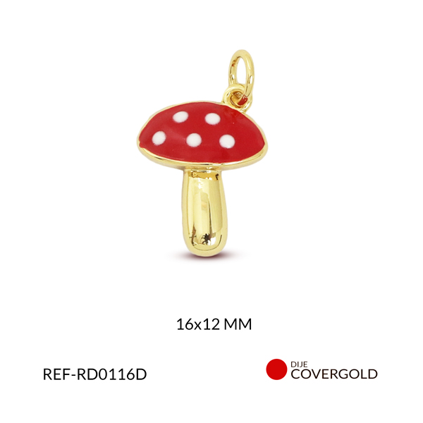 - Uso: Dije en material Covergold con diseño de hongo, decorado con resina roja y puntos blancos que resaltan su apariencia encantadora. Ideal para crear accesorios divertidos, coloridos y Ăºnicos como collares, pulseras o aretes. Aporta un toque mĂ¡gico y moderno a la bisuterĂa artesanal.