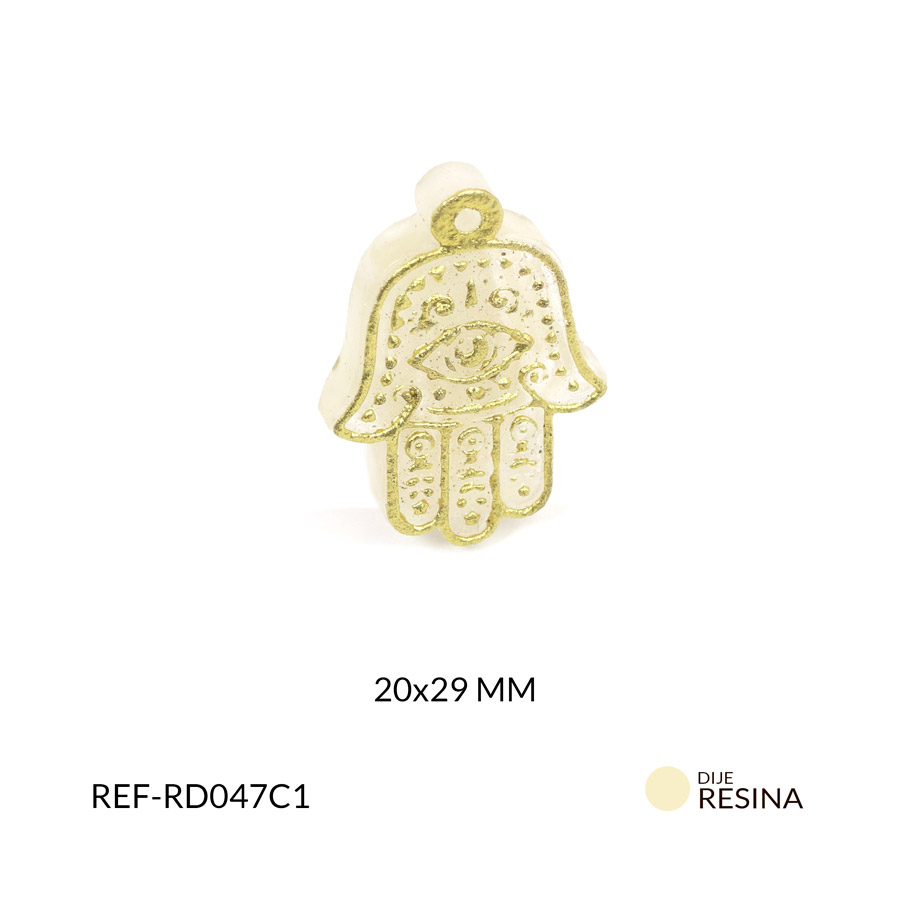- Uso: El dije de resina mano Hamsa combina tonos blanco y transparente con delicados bordes dorados que realzan su diseño protector y elegante. Representa la buena suerte y la protecciĂ³n espiritual, ideal para crear collares, pulseras o amuletos con significado.