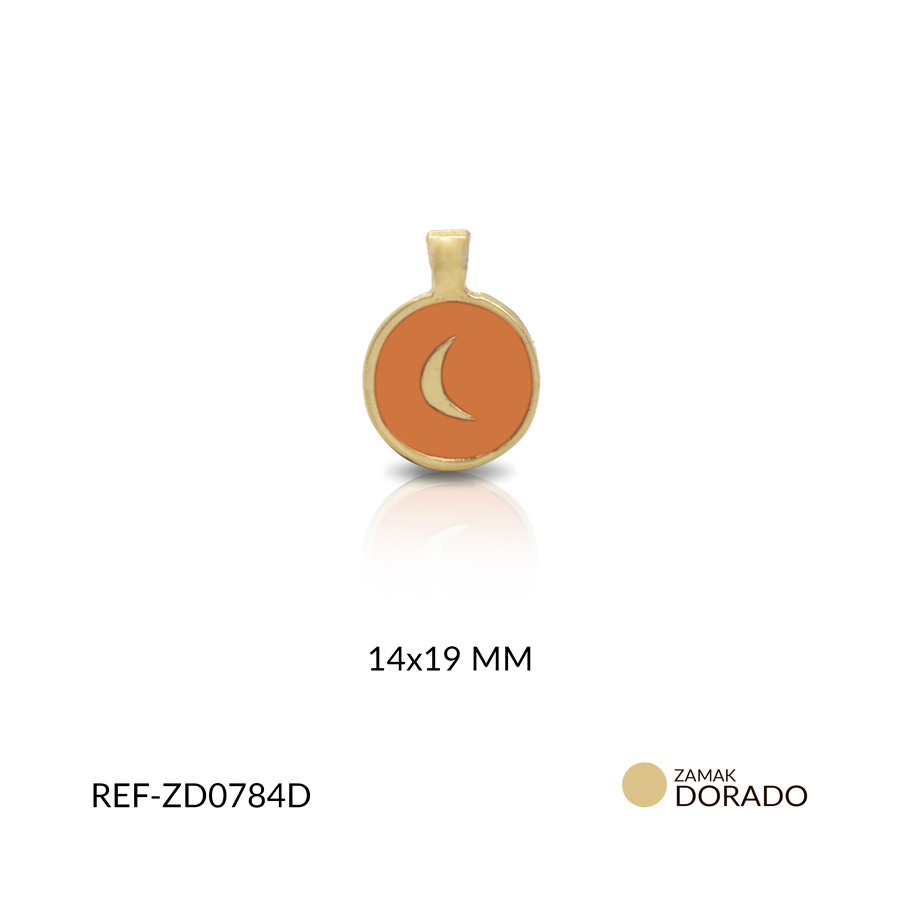 - Uso: Dije en zamak dorado con fondo en resina naranja y diseño de luna en dorado. Su acabado es, ideal para elaborar pulseras, collares o tobilleras. Es un complemento simbólico que representa energía, feminidad y protección en la bisutería artesanal.
