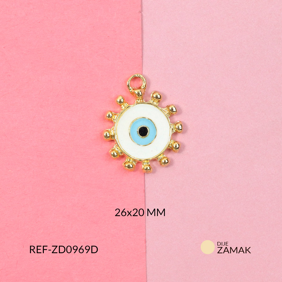 - Uso: Dije de ojo turco en zamak dorado con borde decorativo, ideal para pulseras, collares y accesorios protectores. Su diseño simboliza protección contra las malas energías y aporta un estilo llamativo.