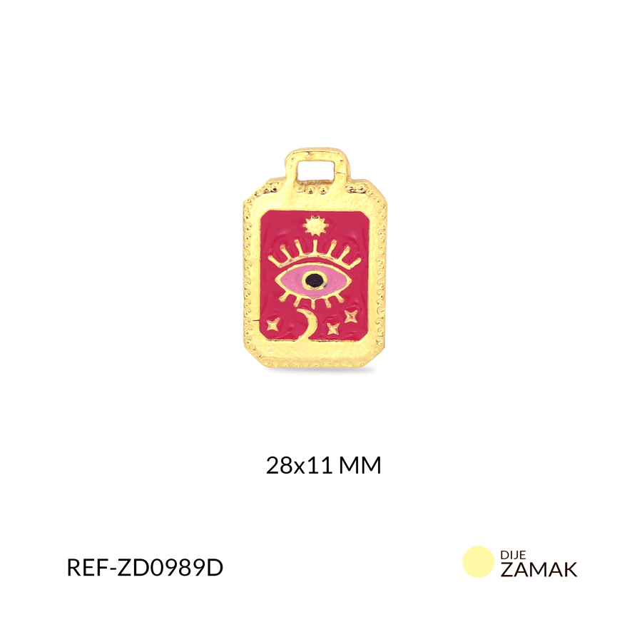 - Uso: Dije en zamak dorado rectangular, con un base de color en tonos rosado y fucsia y detalle de ojo sol y luna en dorado, ideal para emplear como pieza central en collares, brazaletes, manillas, añade un toque místico a tus accesorios.
