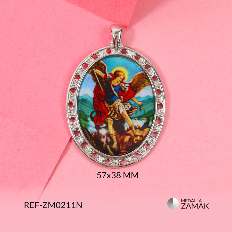 - Descripción: medalla ovalada en zamak con la imagen del Arcángel san miguel bañado bañado en resina.