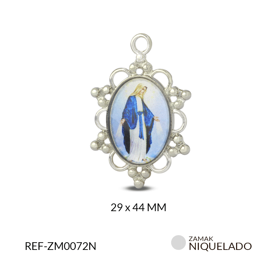 - Uso: La medalla en zamak calada con imagen resinada de la Virgen Milagrosa es ideal para collares, pulseras, rosarios y escapularios. Su diseño calado permite que la pieza luzca ligera y delicada, mientras la resina protege la imagen y realza el color.