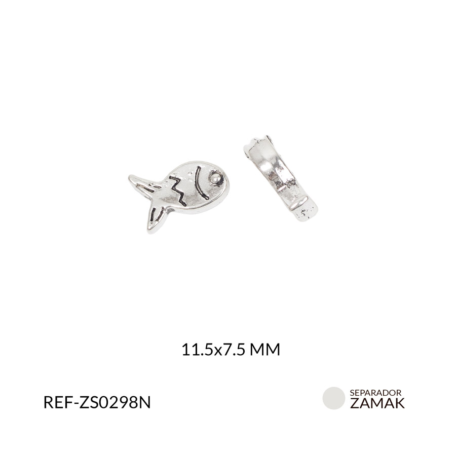 - Uso: Separador elaborado en zamak con diseño de pez en relieve, con acabado metálico resistente y detalles definidos que aportan estilo y textura. Su forma temática lo convierte en una pieza ideal para accesorios inspirados en el mar.